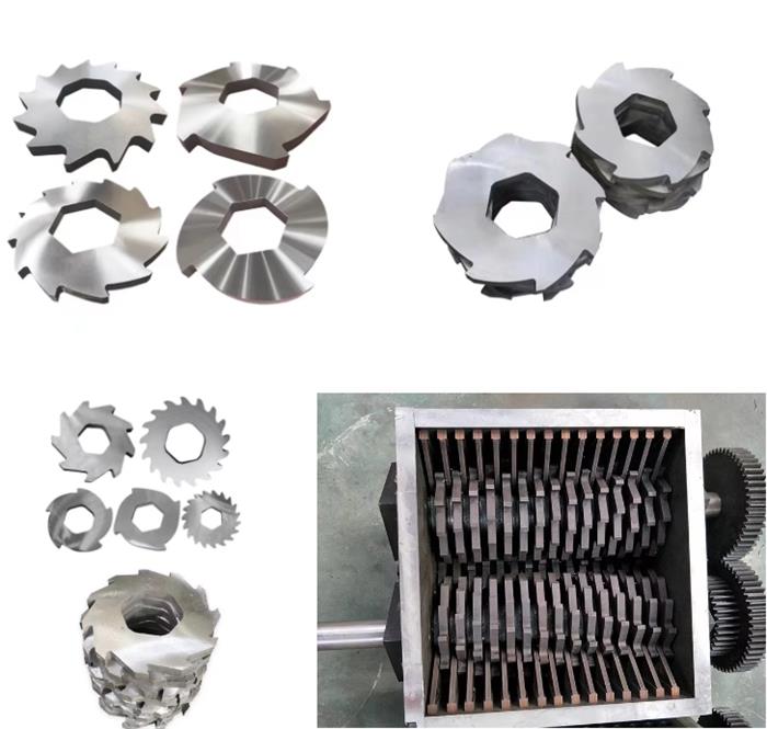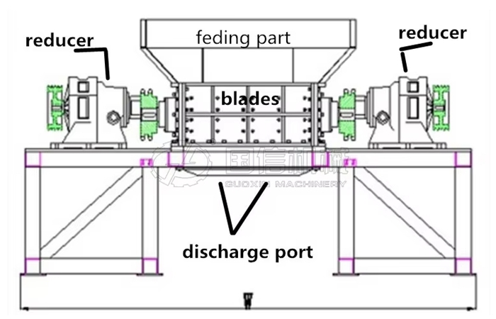Material through the feeding system into the inside of the box, box bearing shredding blade, material after shredding blade tearing, extrusion, shearing and other comprehensive effects, shredding into small pieces of material, discharged from the lower box.