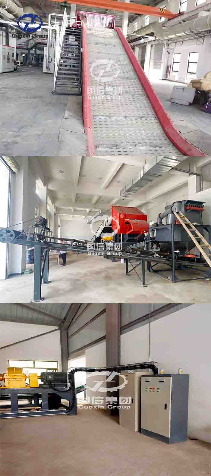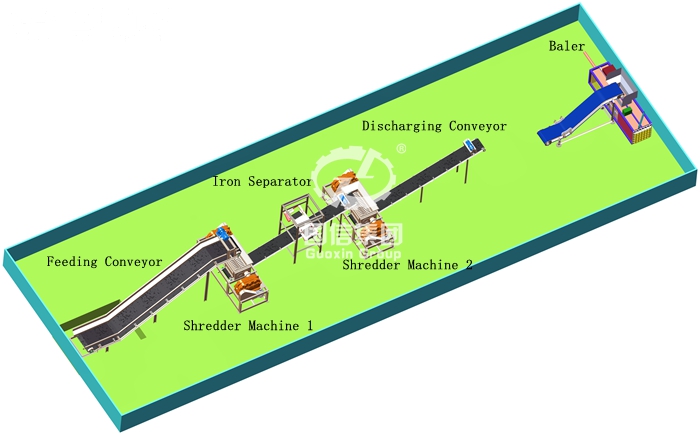 The industrial solid garbage shredding production line designed by Guoxin machinery goes through the rough shredding + iron separator++ fine crusher +baling (or RDF Briquette Machine), the material is sent to the industrial solid waste special shredder through the chain plate conveyor for coarse crushing, after the coarse crushing through the secondary shredder for fine crushing again, and the material after the fine crushing is sorted by the magnetic separator (select iron products). The shredded materials are transported by the discharge conveyor to the RDF forming machine to make fuel rods directly sold to the thermal power plant as fuel, or directly transported to the hydraulic baler to compress and pack, and then sold abroad, which not only disposed of garbage, but also earned profits.